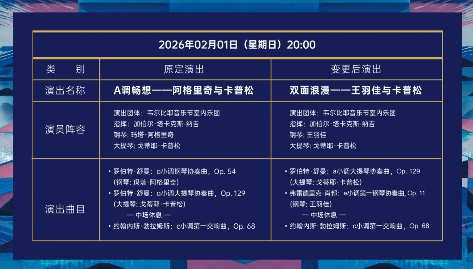 在上个月不久前,深圳方面发布公告称,钢琴家阿格里奇因健康原因无法承受长途旅行,确定取消参加“ 2026深圳,韦尔比耶音乐节”的相关演出;音乐节团队与瑞士韦尔比耶音乐节紧急协商后,敲定涉及 5 场音乐会的阵容与曲目调整方案,其中多场由王羽佳等艺术家接替登台。